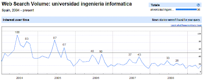 Llevo desde hace tiempo leyendo noticias, opiniones y datos relacionados con que cada vez menos alumnos eligen como carrera la Ingeniería Informática, parece que gustase menos estudiar esta carrera. Concretamente, en la última entrada del blog, el informe de INTECO, mencionaba que había bajado el número de matriculas en informática, también recientemente otros artículos comentan la pérdida de vocación, la falta de inversión en I+D u otros que cometan problemas de motivación. En cualquier caso, a raíz de todo esto, quise profundizar un poco más, y aprovechando que el INE publicó la semana pasada el último dato sobre matriculaciones, el del curso 2007-2008, hice unos pequeños “estudios”, que comento más abajo, uno desde los datos del INE y otro desde Google Insights.