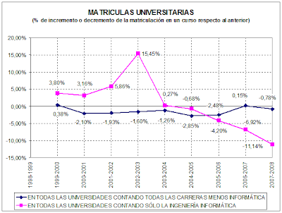 s respecto al curso anterior, un 15,45 %, pero desde entonces las matrículas en ingeniería informática han ido cayendo, continuada y pronunciadamente, hasta el peor dato, el último, que es el del curso 2007 – 2008 donde respecto al curso anterior bajan un importante 11,14 %. En el resto de carreras, si bien casi siempre han ido bajando las matriculaciones, desde el curso 2005-2006 las matriculas en informática bajan porcentualmente mucho más, a un ritmo mucho mayor.