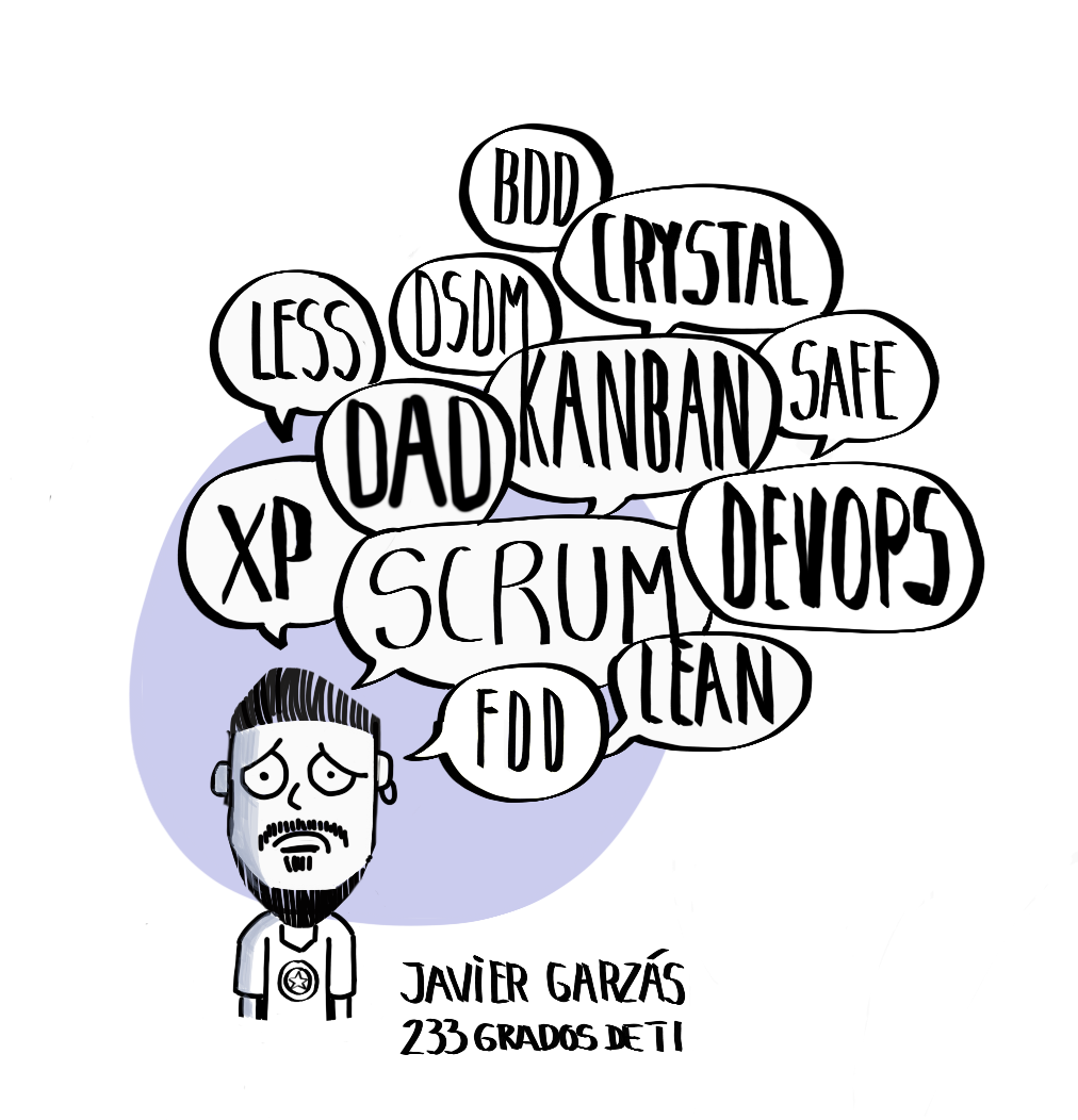 Lo de dibujar en Tablet, me paro aquí un momento, vino de que alguien una vez nos pidió un «trabajito», pero quería que fuera diferente, disruptivo, innovador. Y se me ocurrió que el formato no podía ser texto, tenía que ser dibujo. Pero el formato «texto» se quedaba corto para aquello, así que juntamos los ahorrillos y compramos una Tablet. Finalmente, aquel «trabajillo», después de la inversión, nunca llegamos a entregarlo (aquí lo guardo yo con cariño), por unas razones y otras, ajenas a nosotros. Hubo pequeña depresión… pero del error había que sacar algo positivo y de ahí que tengas Una (nueva) infografía del rol del Product Owner, dibujos como los de Clasificando “métodos” (realmente frameworks) ágiles (y relacionados) o como el que te dejo más abajo.