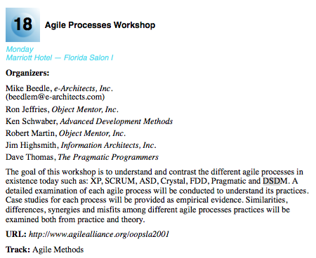 Aunque, como te habré contado decenas de veces, las ideas ágiles vienen muy atrás, fue en el dichoso 2001, concretamente en febrero, cuando se firmó el famoso manifiesto ágil (que ponía el nombre de agilidad a todo el movimiento) y la OOPSLA 2001 se celebró apenas 8 meses después. Y gran parte de los firmantes del manifiesto eran ponentes habituales de las OOPSLAs. De hecho la OOPSLA era una conferencia sobre un paradigma tecnológico llamado Orientación a Objetos (OO) y, como sabes (y sino quizá de para un post futuro), gran parte del origen de la agilidad viene de las comunidades OO…