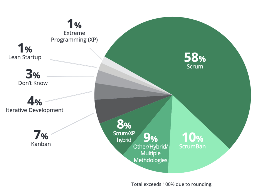 Te aviso, por si es la primera vez que lees el famoso informe sobre «el estado de la Agilidad», es que, aunque ya va por el 14 sigue siendo un poco descuidado en algunas cosas, como usar «método», en vez de framework, o considerar a Kanban (como verás más abajo) como Ágil (sin matizar que por naturaleza no lo es, recuerda el post de Kanban… ¿realmente es ágil?).
