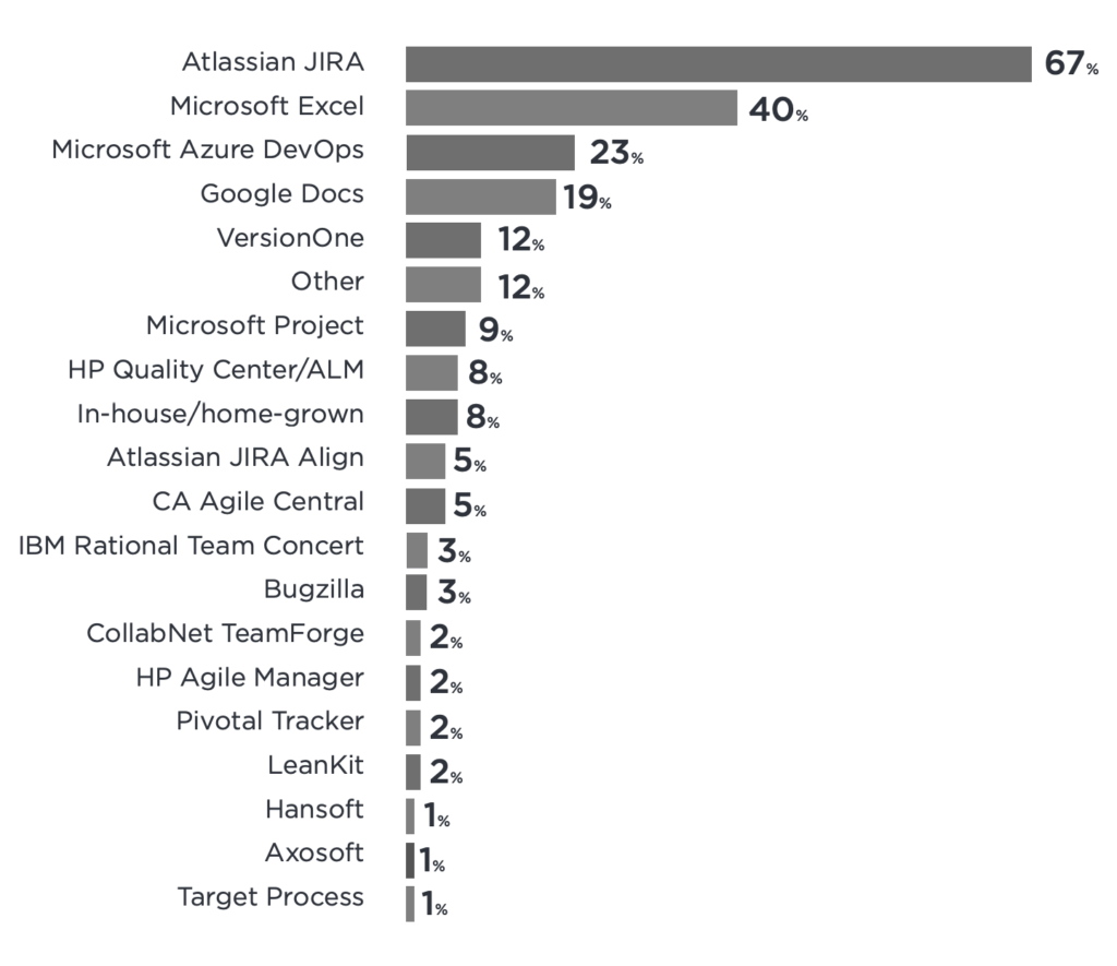 Vamos con otra curiosa, las principales herramientas. Lo primero, lo que no es muy llamativo es que Jira es la herramienta más usada (recuerda, ojo con las 50 sombras (Ágiles) de Jira).
