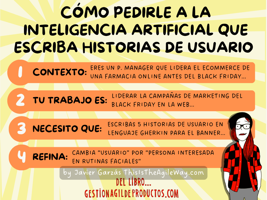 Es por ello que desde hace meses en formaciones, charlas, keynotes , etc., sobre el tema «Product Manager» / «Product Owner»…. más que enseñar a escribir Historias…. enseño a CÓMO DECIRLE a la IA que te las escriba ELLA a ti.
