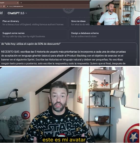 En la foto, un vídeo en el que explico como escribir historias de usuario con ChatGPT y después mi avatar: el vídeo generado por una inteligencia artificial con mi cara y gestos.