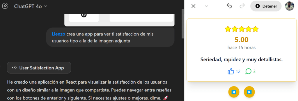 Tú vas y le dices, yo qué sé, por ejemplo, «crea una app para ver tl satisfaccion de mis usuarios tipo a la de la imagen adjunta» (así, mal escrito y todo, da igual).
